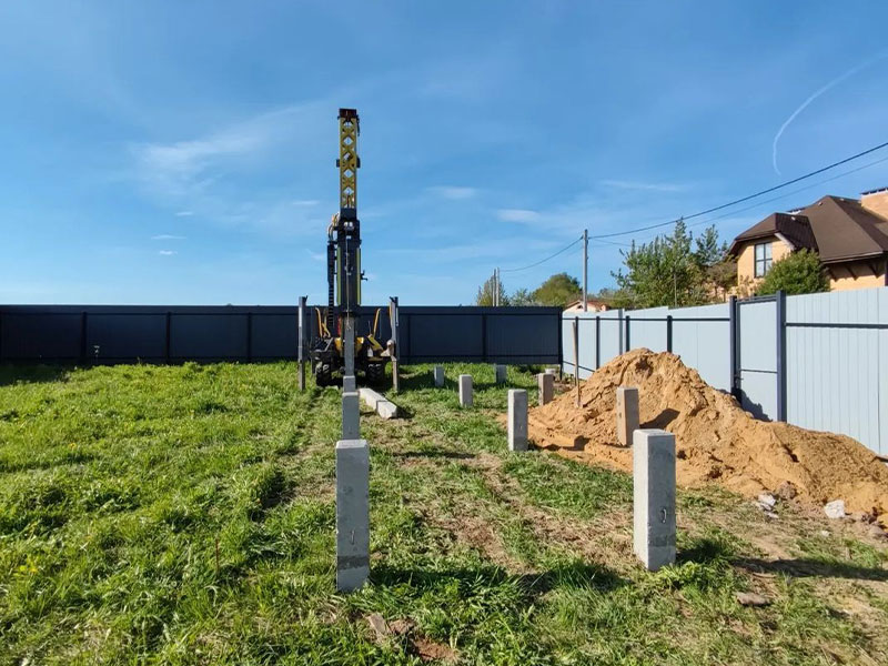 Мы проводим геологическое исследование участка, чтобы определить тип грунта и глубину залегания воды. Это важно для выбора подходящего типа свай и их длины, чтобы обеспечить надежное закрепление фундамента.